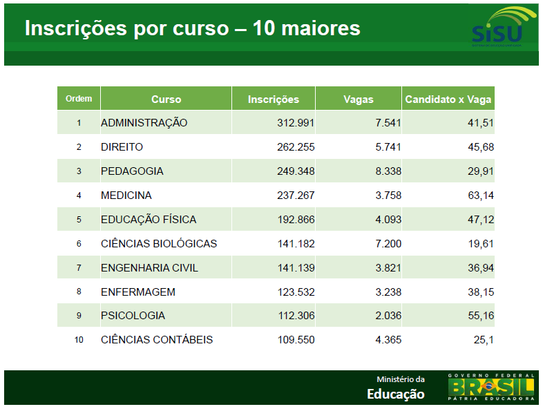 31/01/2016 16:01Administração é o curso com o maior número de inscritos no Sistema de Seleção Unificada (Sisu), segundo balanço divulgado pelo Ministério da Educação. Até a última quinta-feira (22), 295.799 mil candidatos se inscreveram nos cursos de Administração disponibilizados no sistema. Em seguida estão direito (254.217), pedagogia (231.243), medicina (229.771) e educação física (180.430).